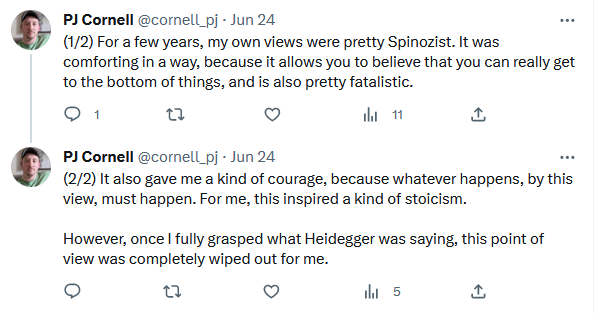 Here, he lays out the core conflict of the essay. In my own reading of Hegel (in this context, a precursor to Marx), I found Heidegger’s work on Dasein to be absolutely instrumental in grasping it. So much so, that I asked Chat GPT to compare and contrast the two thinkers. However, without this frame (as it were), Western thinkers tend to interpret Marx in one of the two ways he describes.